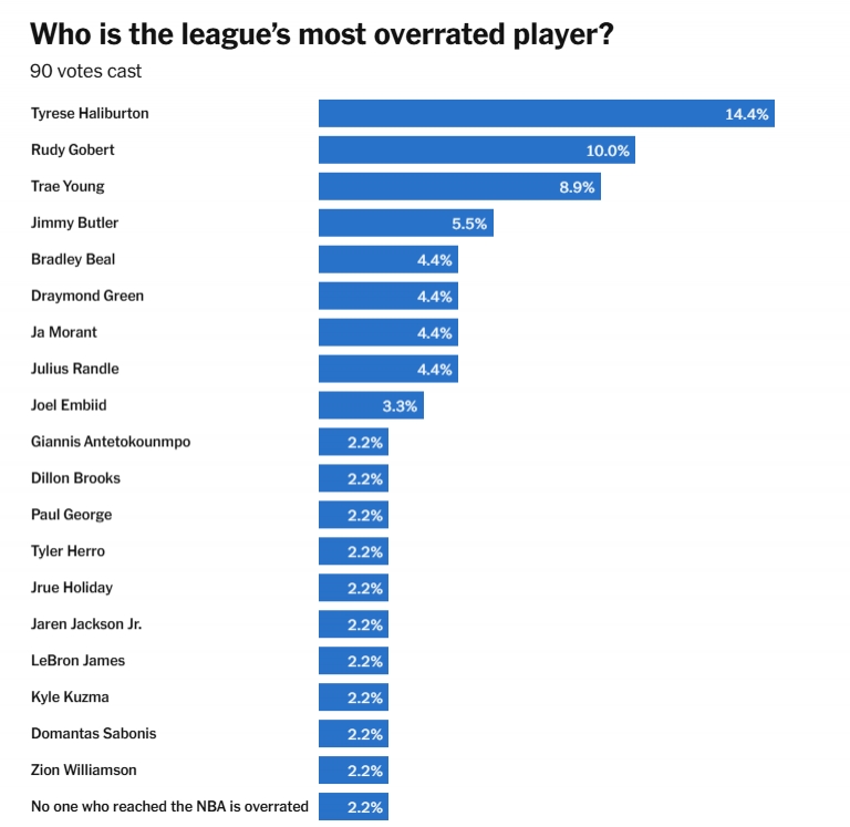 在谁是联盟中最被高估的球员的话题(90人投票)中,哈利伯顿得票最多,达到了14.4%,戈贝尔和特雷-杨分列二三位,恩比德、字母哥、乔治、詹姆斯和锡安等多位球星上榜。