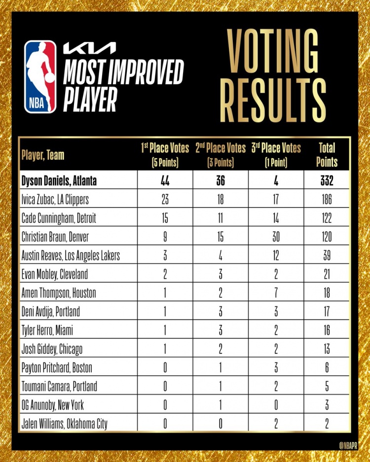 5月1日讯 今日NBA官方宣布本赛季最快进步球员为老鹰球员戴森-丹尼尔斯!投票详情如下: