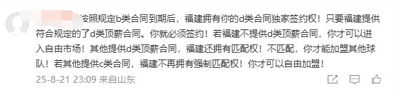 在邹阳的社媒动态下,有球迷评论:“按照规定b类合同到期后,福建拥有你的d类合同独家签约权!只要福建提供符合规定的了d类顶薪合同。你就必须签约!若福建不提供d类顶薪合同,你才可以进入自由市场!其他提供d类顶薪合同,福建还拥有匹配权!不匹配,你才能加盟其他球队!若其他提供c类合同,福建不再拥有强制匹配权!你才可以自由加盟!”