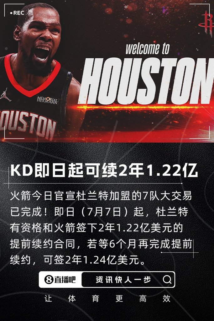 07月07日讯 今天凌晨,杜兰特、卡佩拉加盟火箭的七队大交易获得官宣。据ESPN知名薪资专家Bobby Marks报道,自7月7日(今天)起,杜兰特有...