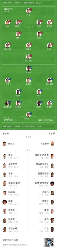富勒姆首发:1-莱诺、2-泰特、5-约西姆-安德森、3-巴锡、33-罗宾逊、16-博格、20-卢基奇、30-塞塞尼翁、18-佩雷拉、17-伊沃比、7-希门尼斯