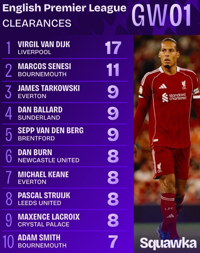 8月20日讯 新赛季英超首轮比赛已经结束了全部争夺,根据Squawka的数据统计,利物浦中卫范迪克是本轮解围次数最多的球员。以下为本轮解围次...