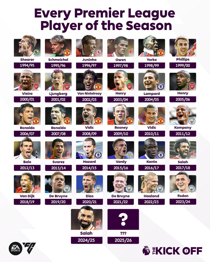 历届英超赛季最佳球员:1994-95 阿兰-希勒 布莱克本1995-96 舒梅切尔 曼联1996-97 儒尼尼奥 米德尔斯堡1997-98 欧文 利物浦1998-99...