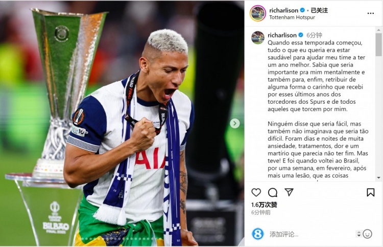 5月26日讯 热刺前锋理查利森社媒晒出与欧联杯冠军奖杯的合照,对这个赛季做出了总结。理查利森写道:“这个赛季开始时,我唯一想要的就是...