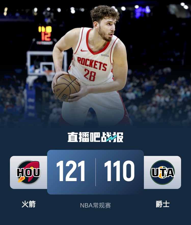 比赛上来,爵士先拿两分后火箭打出一波7-0取得领先,不过顽强的爵士此后一直紧咬比分没有让分差拉开,次节火箭一度将分差拉开到两位数,但是节末又被爵士打出一波反扑攻势,半场结束时分差仅剩2分;下半场回来,火箭重整旗鼓先拿五分,此后也是将分差重新拉开,两队开始围绕着十分左右的分差展开拉锯,末节爵士虽然还有反扑势头但始终无法逆转比赛,最终火箭力克爵士,送给后者四连败。