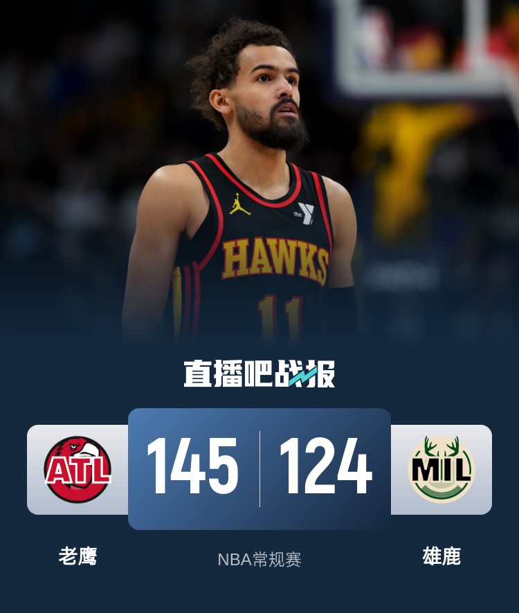 比赛开始,双方开场大打对攻,特雷-杨得分助攻一肩挑,字母哥高效输出强势回应,次节雄鹿命中率下降,老鹰火力全开,里萨谢和丹尼尔斯联手拿分带队反超并确立优势,半场战罢老鹰82-75领先雄鹿。易边再战,雄鹿进攻端依然找不到节奏,字母哥强攻苦苦支撑,老鹰延续火力一举将分差拉开到20分以上,末节双方围绕20分的分差展开拉锯战,老鹰稳扎稳打将优势保持到最后。最终,老鹰145-124轻取雄鹿,送给对手4连败。