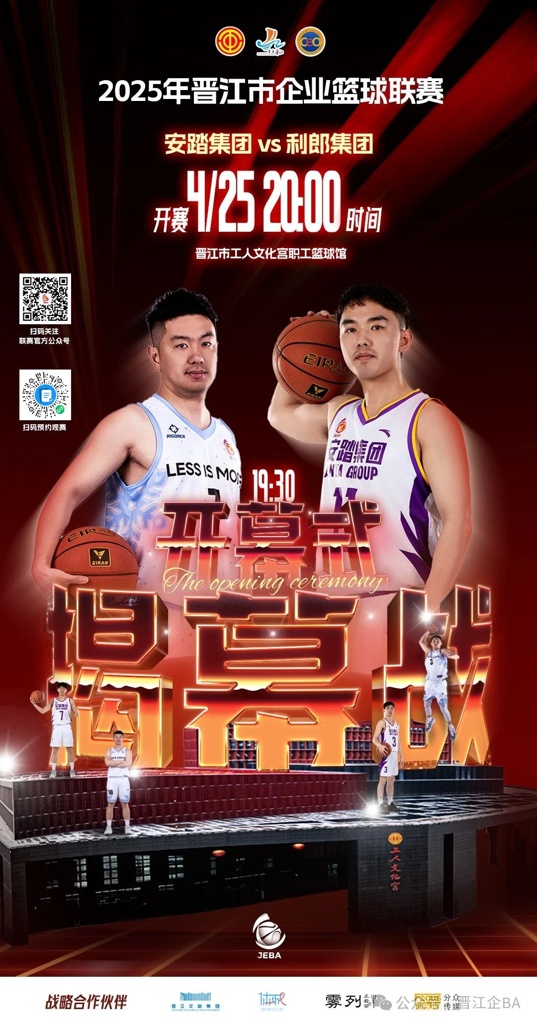 4月25日19:30,2025年晋江市企业职工篮球联赛(以下简称“晋江企BA”)开幕式暨揭幕战将在晋江市工人文化宫职工篮球馆举行。揭幕战将由安踏集团对阵利郎集团。