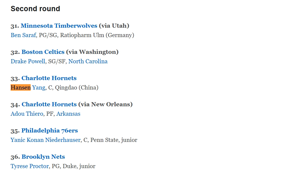 当前位置: 首页 > 篮球新闻 > 连续4期排名提升!ESPN最新模拟选秀:杨瀚森第33顺位被黄蜂选中
