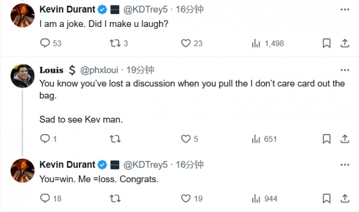 杜兰特:“你=赢赢赢。我=输输输。恭喜你噻。”