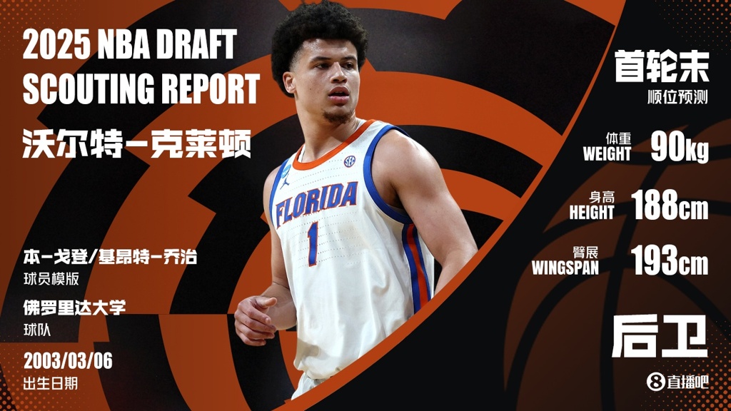 06月26日讯 NBA2025年选秀大会今日在纽约的巴克莱中心举行。首轮第18顺位,华盛顿奇才选择了来自佛罗里达大学的小沃尔特-克莱顿(Walter ...