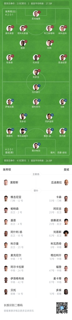 曼城替补:33-卡森、8-科瓦西奇、10-格拉利什、11-多库、25-阿坎吉、45-胡桑诺夫、47-福登、82-刘易斯、87-麦卡蒂
