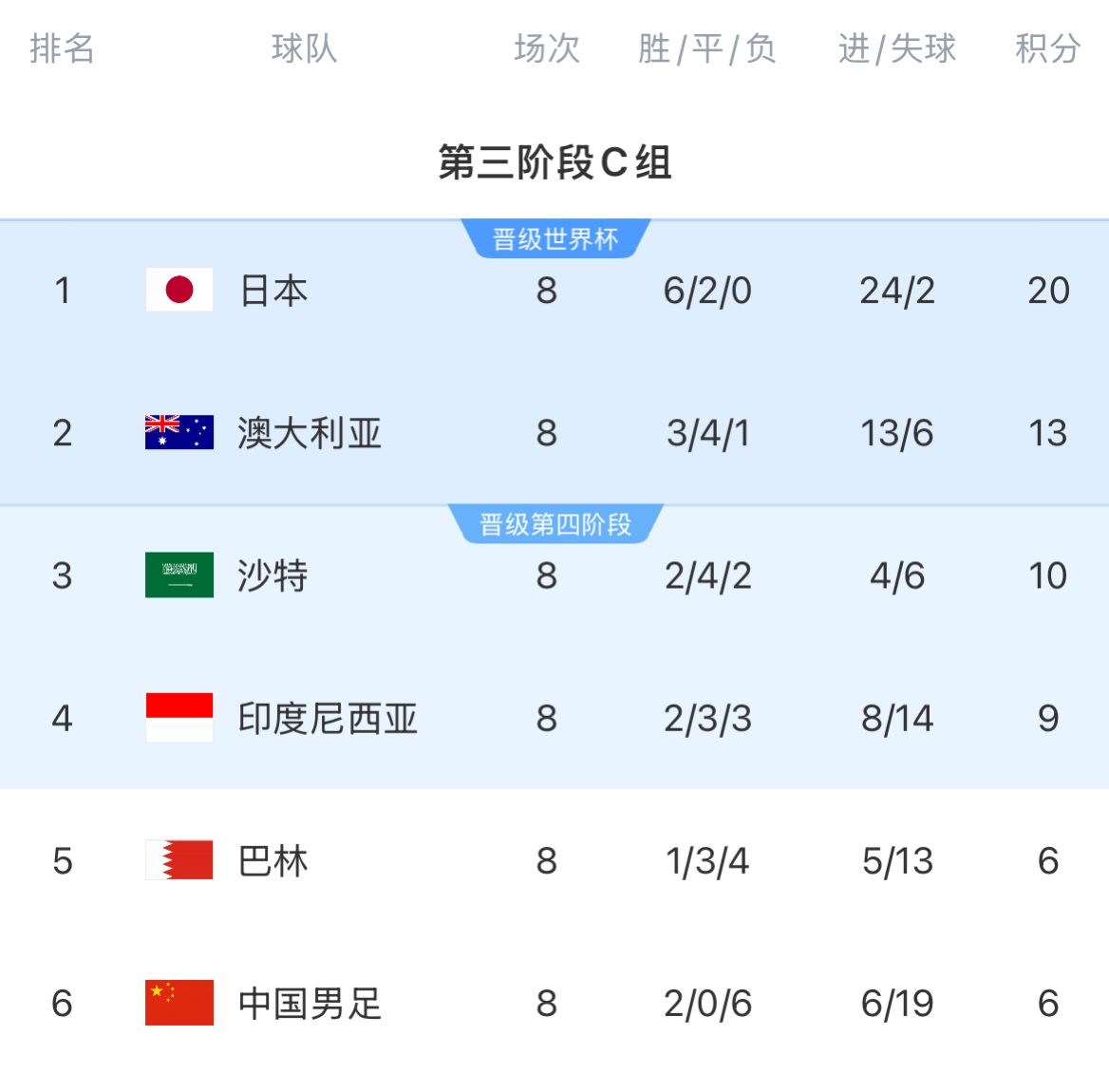 当前印尼以8战积9分位列C组第四;中国则与巴林同积6分,因净胜球劣势小组垫底。