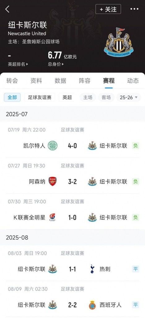 08月09日讯 昨晚的一场友谊赛,纽卡2-2战平西班牙人,季前赛依旧1胜难求,5战2平3负。