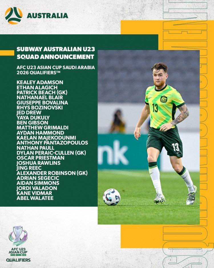 澳大利亚U23公布U23亚预赛大名单,9月1日确认23人名单
