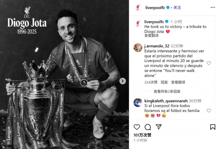 7月4日讯 利物浦前锋若塔因车祸去世,年仅28岁。利物浦官方社媒也撰文悼念:"他将引领我们走向胜利",利物浦球迷曾为他如此高歌——而迪奥...