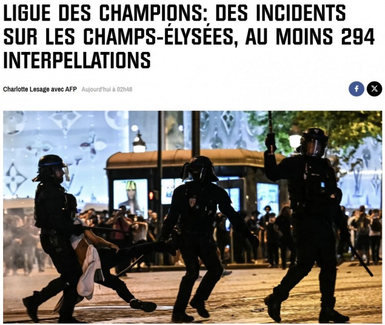 巴黎夺冠后球迷洗劫鞋店+点燃汽车,警方目前已至少逮捕294人
