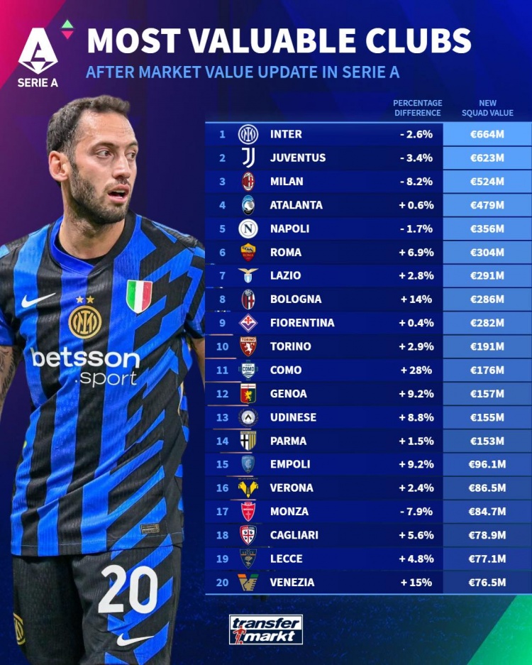 意甲球队德转身价榜:国米6.64亿欧居首,尤文、米兰二三位