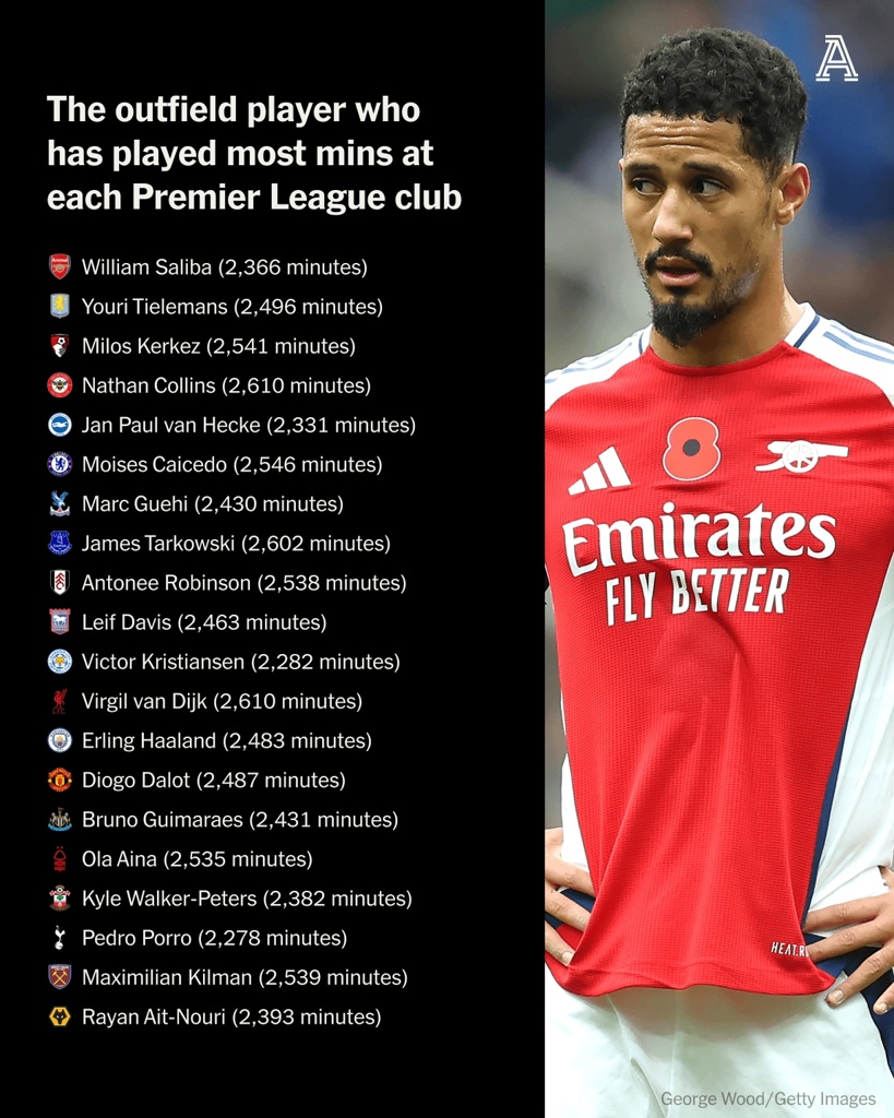 03月24日讯 The Athletic统计了本赛季英超各队出场时间最多的外场(非门将)球员,萨利巴、范迪克、哈兰德、达洛特、凯塞多在列。附英超...